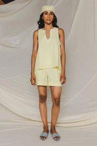 Composition: 100% European Linen Color: Yellow Fit: True to size Length: Top - 22 inch, Short - 16 inch Model Height: 5'9 Size Worn by Model: Small Components: 2 Product Code: SVENIRVLCRDVOL409