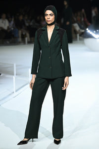 Featuring a structured forest green jacket with soft tailoring, a slight flare, and black PVC hand loop embroidery on the shoulders, this set pairs effortlessly with tailored straight-leg trousers in blended viscose, offering a clean, elongated silhouette with a refined yet fluid drape.