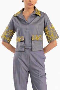This cropped shirt combines the timeless appeal of a regular shirt collar with a placket neckline. It has elbow length boxy sleeves, elegantly finished with two flap pockets, and a asymmetric hem.