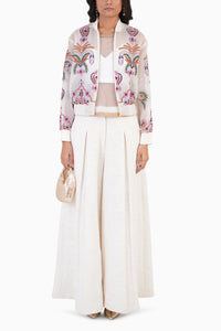 Featuring the Artisan Bomber Jacket with Top and Structured Pants Set, this chic ensemble includes a delicately embroidered organza jacket, a hand-embroidered net top, and plain handloom cotton slub palazzo pants. Combining artisanal craftsmanship with modern silhouettes, it offers a versatile, elegant look perfect for special occasions or stylish layering.