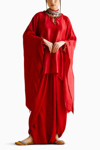 Featuring Arundhati Red Kaftan with Skirt by 5 Elements by Radhika Gupta from Mitti Collection. The Modal Saturn Kaftan adorns a chic kaftan-style upper, enhanced with handcrafted bead and metal embellishments. Paired up with a matching skirt, merging elegance with artisanal craftsmanship for a standout, sophisticated look.