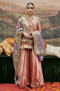 Pink tissue sharara set with peplum style tunic has zari and mirror work and a gota border , styled with a lilac mirror dupatta.
