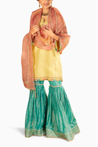 A chanderi silk kurta handmade with aari and resham embroidery, highlighted with sequins, cutdana, stones, pearls and glass beads. Paired with a contrasting tissue gharara and organza dupatta.
