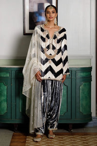 Featuring the Asfi Black & White Embroidered Kurta and Patiala Salwar with Dupatta — a chic and sophisticated set crafted from luxurious chevron velvet kurta with detailed embroidery, paired with black & white embroidered stripe velvet Patiala salwar. The look is perfectly complemented by a delicate 3 Dot Mukaish Organza dupatta. This ensemble showcases a stylish blend of printed and embroidered elements in classic black and white, designed for a relaxed fit that ensures both comfort and elegance.