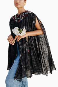 Featuring Ash Cape by Auruhfy from Advaya Collection. This crushed lurex cape has all-over motifs which are hand-embroidered with resham work and highlighted with pearls. Indulge in the chic sophistication with this cape.