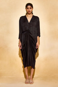 Minimalist in tone, maximalist in detail—the Echo Ash Dress is a contemporary classic. Designed in a muted ash hue, this dress features clean lines, fluid draping, and a flattering silhouette that skims the body with elegance. Crafted in a lightweight, lustrous fabric, it flows with grace while maintaining subtle structure. Fluidity meets form in the Echo Ash Dress—a modern drape-style silhouette designed for the effortlessly elegant. this dress features relaxed kaftan sleeves that flow beautifully with every movement. The half-belted waist subtly cinches the form, adding structure to the otherwise free-flowing silhouette