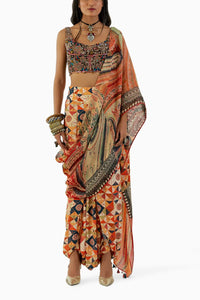 Wrap yourself in elegance with the Ash Green Sadhvi Drape Saree. The Multi Print saree is accentuated by a waistband, crafted from natural crepe, offering a relaxed yet sophisticated ensemble.
