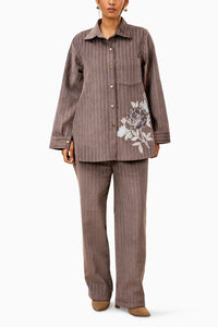 This relaxed coduroy coord set with pants in pinstriped ash grey colour with jacquard applique embroidery.