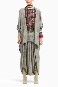 Featuring the Ash Grey Kuru Trapeze Kurti Set by Aseem Kapoor from Beyond Ken-3 Collection. This set features a printed trapeze kurta with an embroidered and feathered yoke, paired elegantly with drape trousers. The kurta showcases Resham thread embroidery, cowrie shells, feathers, beads, and tassel details, combining traditional elements with modern design. Designed for comfort, the kurta offers an easy fit, while the elasticated waist trousers ensure ease of wear and a flattering silhouette.