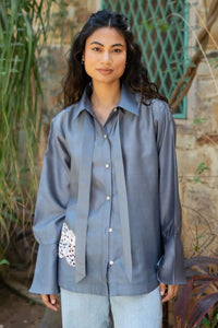 Featuring Ash Grey Mia shirt from URAIB's collection Summer Lovin'. The product is made from 100% cotton chanderi highlighing the hand embroidered butterfly along with a bow-tie detail.