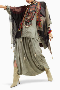 Featuring the Ash Grey Veni Dupatta Jacket Set by Aseem Kapoor from Beyond Ken-3 Collection. This set includes a printed trapeze kurta with an embroidered and feathered yoke, paired with drape trousers and a dupatta jacket. The kurta is adorned with Resham thread embroidery, cowrie shells, feathers, beads, and tassel details, blending traditional craftsmanship with contemporary flair. Designed for comfort, the kurta offers an easy fit, while the elasticated waist trousers ensure flexibility and a flattering silhouette. The sheer silk jacket adds an element of elegance and versatility to complete this sophisticated ensemble, perfect for a blend of cultural richness and modern style.