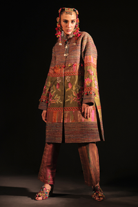 Introducing a masterpiece of artisanal craftsmanship: the embroidered panel handloom silk band collar coat. This coat exemplifies elegance and sophistication with its luxurious handloom silk fabric and intricate embroidery detailing. The band collar adds a touch of refined tailoring, framing the neckline elegantly while maintaining a clean and modern silhouette. The coat's structured design enhances the wearer's presence, making it suitable for both formal occasions and everyday wear.