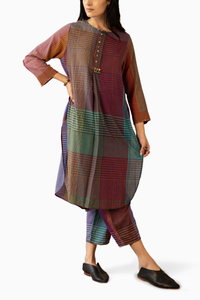 Handwoven Yarn Dyed Silk/Cotton Kurta. Handwoven Yarn Dyed Silk/Cotton Pant With Hand Block Printed Patched Detail On Side And Side Hem Beaded Detail.