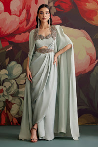 Elevate your style with the Asmani Cape Saree Set in a serene pale blue hue. This pre-draped saree features a flowing cape, crafted in pure crepe and adorned with intricate dori work, cut bead, and zardosi embroidery. Comes with a fitted blouse and skirt.