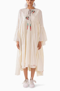 Featuring a flowy, asymmetric silhouette, this Cream Voil Dress from the Chilli collection is elevated with a bold chilly highlight and accented by a handcrafted chilly hanging, bringing a touch of whimsy to effortless elegance.