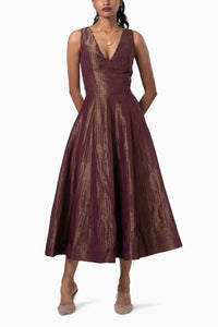 A voluminous midi dress constructed in Organza and Zari with a fitted bodice and kalis from the waist down.