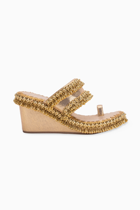 Featuring Asteria Gold Wedges by 5 Elements by Radhika Gupta. Elevate your style with stunning gold wedges adorned with intricate embroidered ghungroo work. The fusion of glamour and tradition creates a captivating ensemble, perfect for any special occasion. Step into sophistication with these golden treasures that effortlessly blend modern fashion with timeless charm.