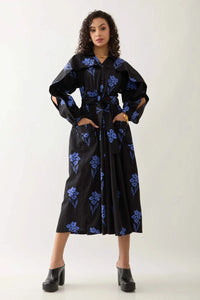 Featuring a timeless collared design, the Aston Dress with Black Grape Print showcases a black button-front, waist tie-up, and flap pockets for style and function. Layered ruffled sleeves with slits add dynamic elegance, making it a versatile choice for both casual and elevated occasions.