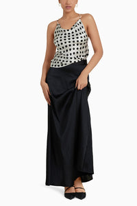 Featuring Astoria Polka Top with Chelsea Black Skirt by Malie. This co-ord set includes a white black polka top with Black Satin Skirt. The top has a cowl neckline with round straps that tie at the back. It also includes a side zipper for a comfortable fit and is made from classic polka-dot satin fabric. Paired with the black satin skirt which has a flowy, A-line silhouette with a side zip for a perfect fit at the waist. Falling to a full length, it exudes elegance and luxury with its satin fabric construction.