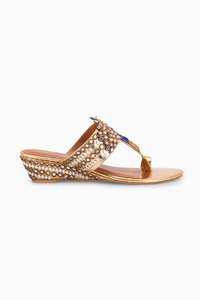 Featuring Astraia Peacock Heels by 5 Elements by Radhika Gupta. Elevate your style with these exquisite Gold Heel Kolhapuri sandals adorned with intricate Moor Goota design. Seamlessly blending traditional charm with contemporary flair, the radiant gold heel adds opulence, perfect for both ethnic and modern ensembles. Comfortably crafted with double cushioning for an extra luxurious experience.