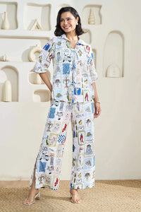 Crafted in breathable cotton schiffli, this co-ord set features a vibrant multicoloured print. The shirt comes with quarter sleeves and is adorned with a handmade drawcord finished with delicate beaded tassels. Paired with matching wide-legged pants, it’s the perfect pick for sunny days and carefree moments.