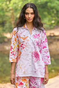 Featuring an asymmetric hand-painted floral print on organic cotton, this front button-down shirt is designed with relaxed-fit cropped sleeves and marble with gold inset buttons at the front placket and sleeve cuffs. Side slits add a touch of ease and movement to this effortlessly stylish piece.