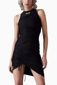 Introducing our chic Asymmetric Ruched mini short draped dress, crafted from responsibly sourced viscose fabric in timeless black. Its body-hugging silhouette effortlessly flatters, while a concealed side zip closure ensures a smooth fit. Adorned with the iconic Cilvr signature metal monogram, this dress combines contemporary style with classic elegance. Ideal for any occasion that demands sophistication and sustainability.