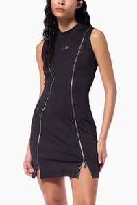 This lycra jersey dress is defined by edgy asymmetrical zippers that contour and enhance the silhouette. The form-fitting lycra jersey fabric ensures a bodycon fit, while the sleeveless design adds a modern touch. In classic black, this dress combines bold, fashion-forward details with sleek sophistication.