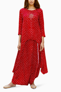Featuring exquisite embroidered motifs Long Back and Short Front Kurta. Paired seamlessly with an Overlap Dhoti Skirt, this ensemble blends traditional charm with contemporary flair.