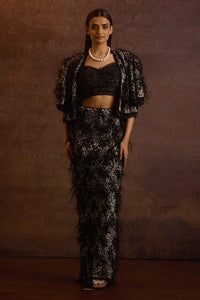 Featuring Atha Lace Blouse with Feathered Crop Jacket and Pencil Fit Skirt by The House of Exotique's Nagma Collection. The sweetheart neckline lace blouse is padded, embellished, and features cut sleeves with a back hook fastening. The feathered crop jacket, crafted from lace, has bell sleeves and a center slit. The fully embellished pencil fit skirt features a center back slit and side concealed zipper fastening. Crafted from lace and Chantilly lace, this bold black ensemble is a statement of sophistication and glamour.