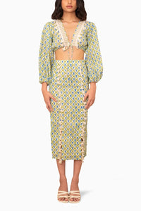 Featuring the Athens Handblouse Blouse & Skirt Set by Kalakaari by Sagarika Singhvi, a graceful co-ord crafted in cotton, with handblock prints in offwhite and blue green. The lace-detailed blouse and pencil skirt blend vintage charm with a modern silhouette.