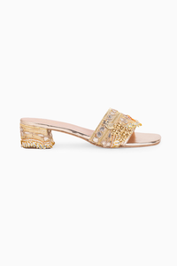 Featuring Atlas Gold Heels by 5 Elements by Radhika Gupta. Elevate your style with our exquisite Gold Heel Slider featuring intricate Gota embroidery. This chic footwear seamlessly blends comfort with opulence, making it a statement piece for any occasion. The shimmering gold heel adds a touch of glamour, while the detailed embroidery showcases craftsmanship that captivates with every step.