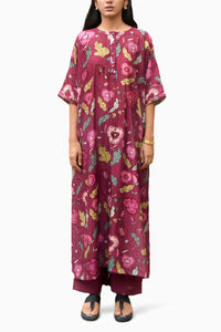 A radiant combination of delicate foliage digital print and artisanal work, this kaftan kurta is made of chanderi silk in wine red color. It has a button-up placket adorned with handcrafted buttons and has intricate beadwork hand embroidery all over the front and sequin detailing on the sleeves. It has side pockets and comes with a floral print chanderi straight pants. It can be your relaxed companion for special gatherings or festive occasions.