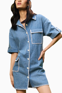 Featuring the Audrey Dress: a contemporary marvel in indigo Twill Denim. This slim-fit masterpiece offers both comfort and elegance, perfect for any occasion. Elevate your style with this timeless creation.