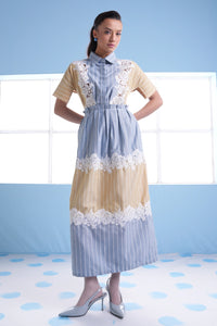 Featuring Audrey Lace Patchwork Dress by Mero's DOT collection. Crafted in cotton with intricate lace cutwork and patchwork, this dress showcases a striking blue and yellow striped colourblock design. Delicate lace details add a soft, feminine touch to this playful yet refined silhouette.