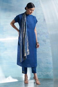 Step into sophistication with our Aura Neck Scarf Kurta, a masterpiece of contemporary elegance in regal royal blue. Crafted from premium breathable linen, it offers both comfort and style, making it a versatile choice for any occasion. The delicate shimmer embellishment at the neckline adds allure, catching the light with every movement. Paired with shimmering pants, this ensemble is perfect for elevating your look at any event or celebration. The pants feature an elasticated waist and drawstring for added comfort.