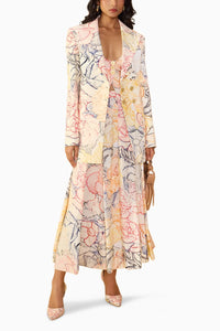Featuring the Aura Scratches Miranda Blazer with Delfie Waistcoat & Polina Trouser by Saaksha & Kinni's Akara Collection A/W'25. This co-ord set features a floral print relaxed-fit blazer, plunge-neck waistcoat, and high-waist box pleat 3/4 trousers with pockets- unifying structure and softness.