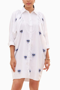 This elegant white shirt dress is a versatile addition to any wardrobe, ideal for both casual and semi-formal occasions. Made from lightweight and breathable fabric, it features a classic button-down front and a pointed collar, offering a timeless and polished look. The dress is decorated with unique heart-shaped motifs that contain protective evil eye designs, adding a touch of charm and individuality. The loose, relaxed fit ensures all-day comfort, while the long sleeves can be rolled up for a more laid-back vibe. Pair this dress with your favorite heels or flats for an effortlessly chic outfit.