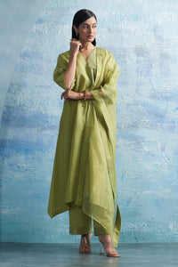 Embrace elegance with our sheen green kurta set, crafted from a premium blend of linen and cotton shimmer. Its timeless silhouette flows gracefully, exuding chic charm. The fabric's subtle sheen creates an enchanting interplay, captivating the eye. Paired with flowy cotton satin pants featuring an elasticated waist and drawstring for a perfect fit, this set combines comfort and style effortlessly. The look is completed with a sheer organza dupatta, adding a touch of sophistication.