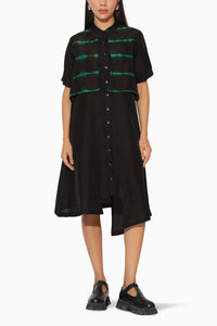 Featuring Auralis Black Dress by Linetribe, an elegant asymmetric shirtdress that exudes timeless sophistication. Designed with a subtle shine and a hand-done Shibori upper panel, it blends artisanal detail with modern allure for a effortlessly refined statement look.