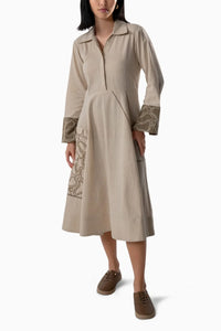This exquisite Aurelia Luxe Dress blends timeless elegance with artisanal craftsmanship, showcasing intricate hand-embroidered patterns in rich earthy tones.