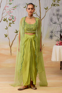 Featuring the Aurika Cape Set in elegant green silk organza, this ensemble showcases intricate block printing and hand embroidery on a flowing cape, paired with a delicately thread and hand-embroidered blouse, and styled effortlessly with a draped satin skirt—an exquisite blend of traditional craftsmanship and modern silhouette.