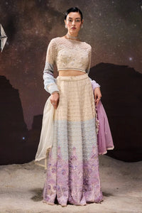 A poetic blend of celestial hues and intricate embellishments, this ombre lehenga set exudes ethereal charm. The delicate pearl embroidery and sheer details create a mesmerising cosmic allure.