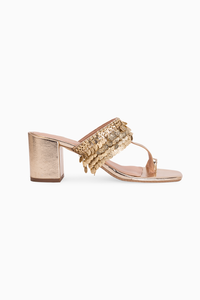 Featuring Aurora Heels by 5 Elements by Radhika Gupta. Step into opulence with our Gold Heel Kolhapuri adorned with intricate gold embroidery and a mesmerizing metallic gold coin design. Each step is a statement of elegance, blending traditional charm with contemporary style. Elevate your ensemble with these handcrafted treasures, merging cultural richness and modern allure effortlessly.