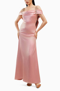 Featuring Aurora Square Neckline With Dimontee Strap Back by Brinda Sneha by their Love Locked Collection. It's a signature full-length gown that features a cowl neck draped bodice, elegantly framing the neckline with soft, cascading folds. Exaggerated off-shoulder sleeves with diamonte straps add a dramatic and romantic flair, gracefully enhancing the overall silhouette. The skirt flows effortlessly, creating a sense of movement and sophistication, making this gown an exquisite choice for bridesmaids and birthdays.