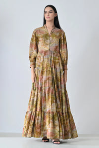 An effortlessly romantic maxi dress featuring soft tiered layers and an artistic floral print inspired by autumn landscapes. The gathered waist and flowing silhouette create graceful movement, blending relaxed elegance with timeless femininity.