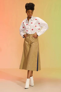 Featuring Avery Khakhi Calf Length Trousers by Chilosophy's Queendom Collection, these retro-inspired trousers offer a flattering silhouette. With contrast piping, box pleats, zip fly opening, and a relaxed fit with a flared hemline, they pair perfectly with our poplin shirts.