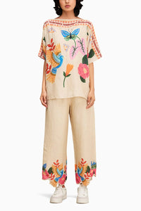 The Beige Avian Canopy Kimono Top features intricate cutwork detailing along the hem, offering a delicate yet stylish touch. Crafted from linen, this top combines comfort with elegance, making it an ideal choice for both casual and semi-formal occasions. Its flowing silhouette adds to its sophisticated appeal.