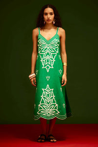 Featuring an avocado green strappy cotton dress with ivory flame thread embroidery, this relaxed-fit design is crafted from cotton poplin, offering a fresh, playful look with all-day comfort.