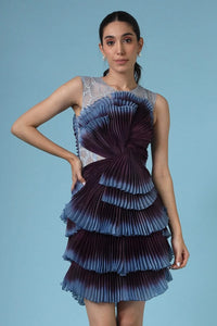 The 'Avrille' dress features micropleating, the print draws inspiration from the fins the Siamese fighting fish and drama is added in the form of a structured ruffle that sits across the shoulder and the waist. This outfit is a statement piece which is set to draw attention anywhere it's worn, with a style like this we suggest you go with statement jewelery and a little bit of fun with hair and make up can really amp up the drama.